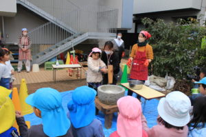 つきたてのおもちをお母さんたちがホールで丸めてくださいます。みんなで興味津々で見ています。