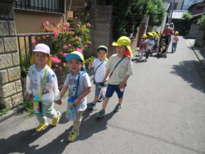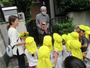 ご近所のおじいちゃん、おばあちゃんにお花とお歌をプレゼントしに行きました。とっても喜んでくださって温かい気持ちになったね。