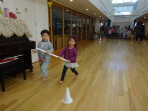 たんぽぽ組ひよこ組さんとひかり組ことり組さんが長い棒を持って力を合わせて一緒に走りましたよ!