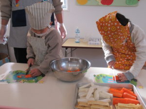 包丁で大根や、にんじんを切ったり、しめじを小さくしたりしました。