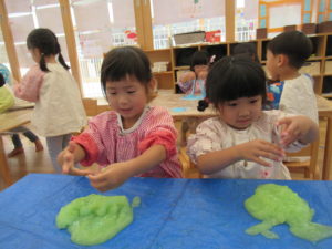 洗面器に絵の具、洗濯のり、ホウ砂水を入れて混ぜ、スライムを作りました!