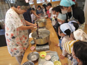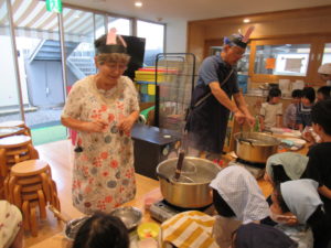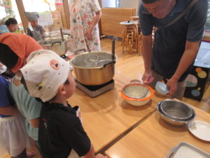 できたおだんごを「つきのうさぎ」さんと「つきのうさこ」さんに大きなお鍋でゆがいてもらいました。お鍋にポチャ~ン!あ、浮いてきた⁉