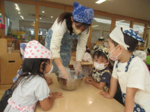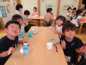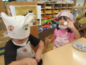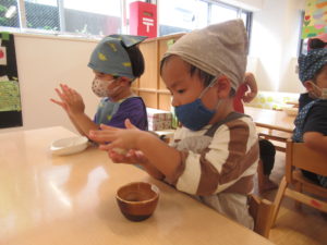 ★今日は仲秋の名月。みんなでお月見だんごを作ったよ。先生にこねこねしてもらって、自分でまる~く丸めました。ほら、こんなにま~んまる!