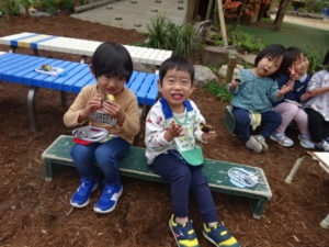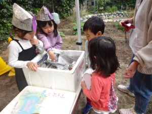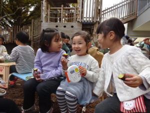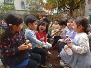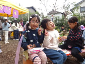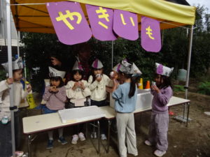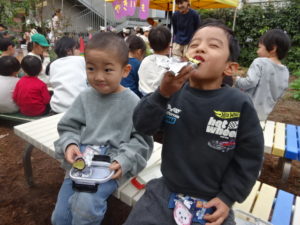 あたたかな秋の昼下がり、お弁当を食べた子から園庭の焼き芋やさんに集まりました。