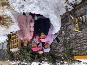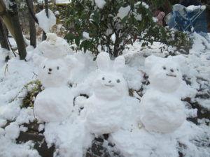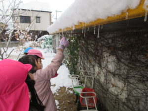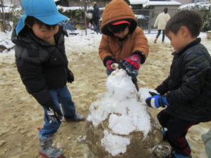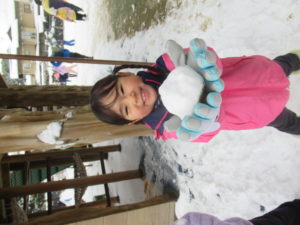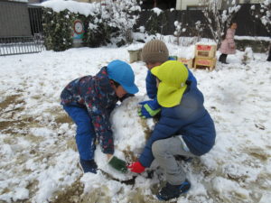かまくらづくりに挑戦!!!時間切れで大きなお風呂みたいになったね(笑う)雪だるまが園庭に全部で14個!!! 帰るまでに残っていたらいいね♪